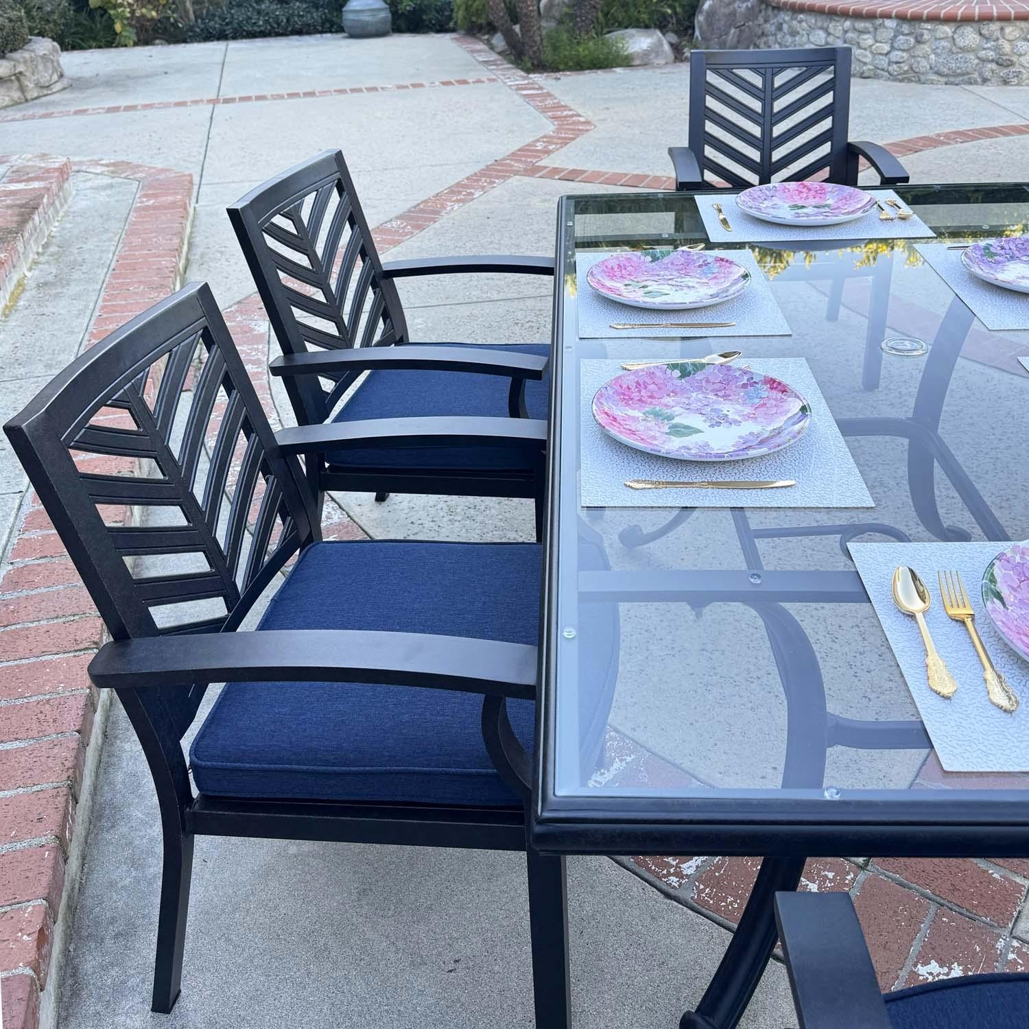 - Includes: 6 Dining Chairs with Cushions, and 1 Rectangular Glass Top Dining Table