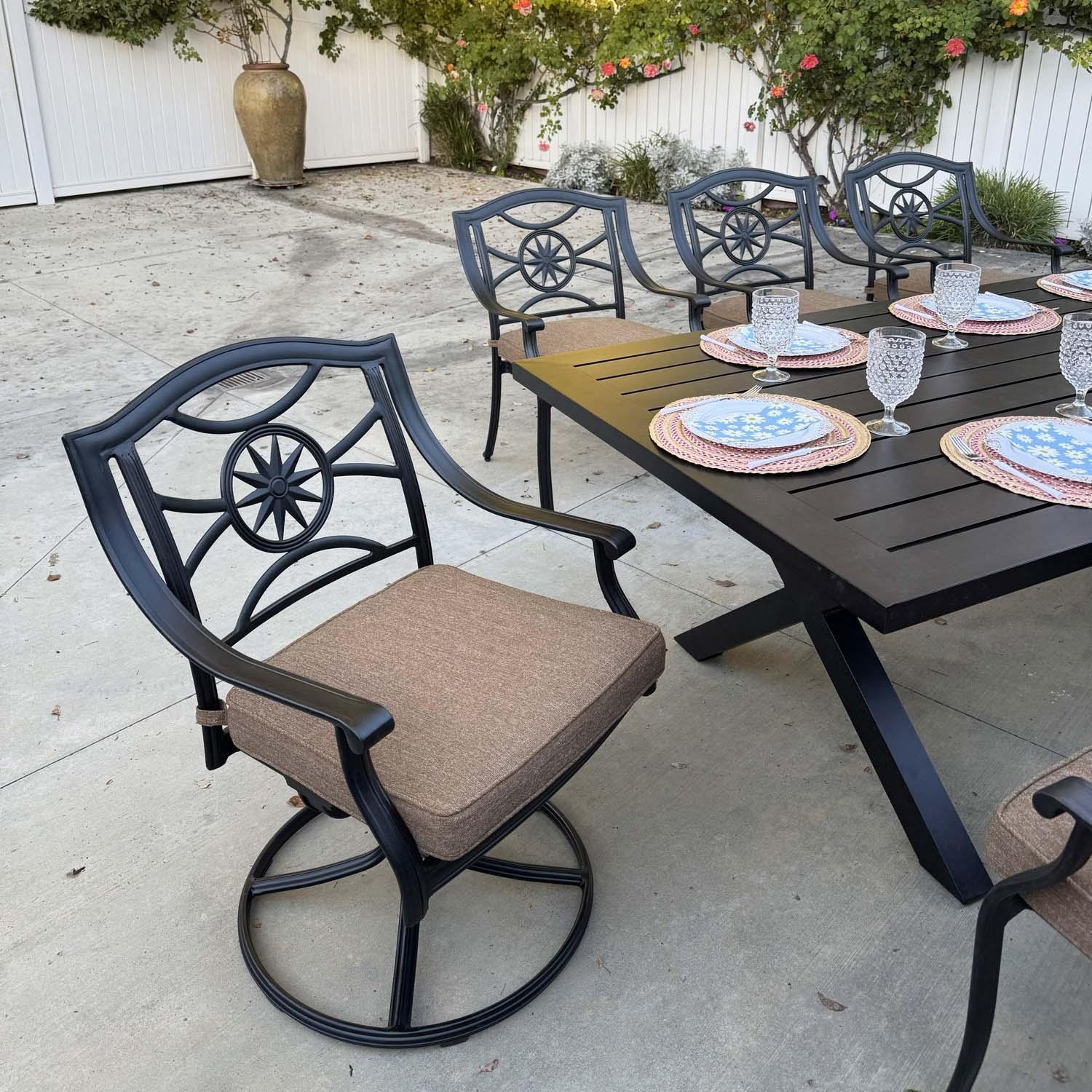 - Includes: 6 Dining Chairs, 2 Swivel Rocker Chairs, Cushions and 1 Rectangular Dining Table