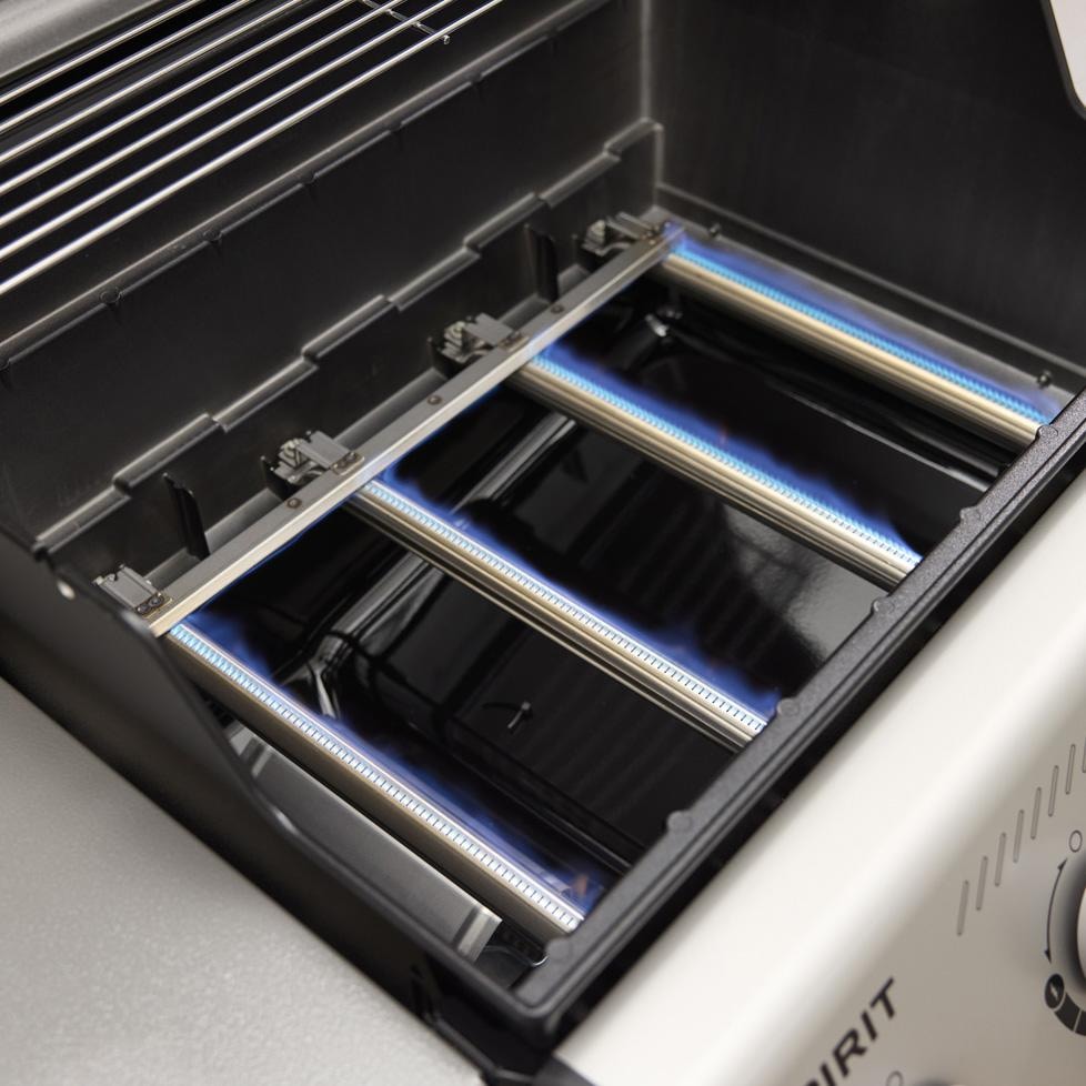 - Porcelain-enameled, cast-iron cooking grates retain even heat