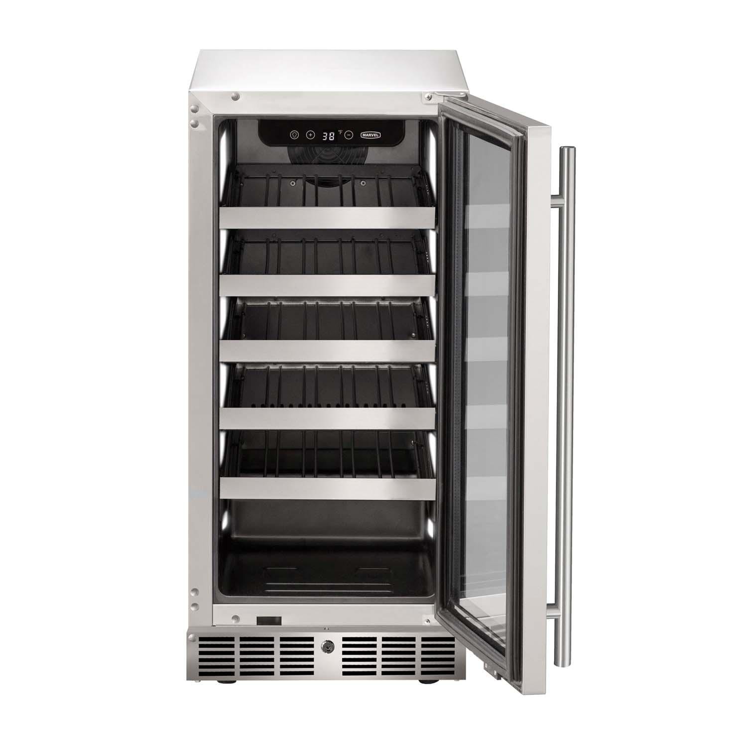 - Matte black interiors with stainless steel accents on wine racks and shelves