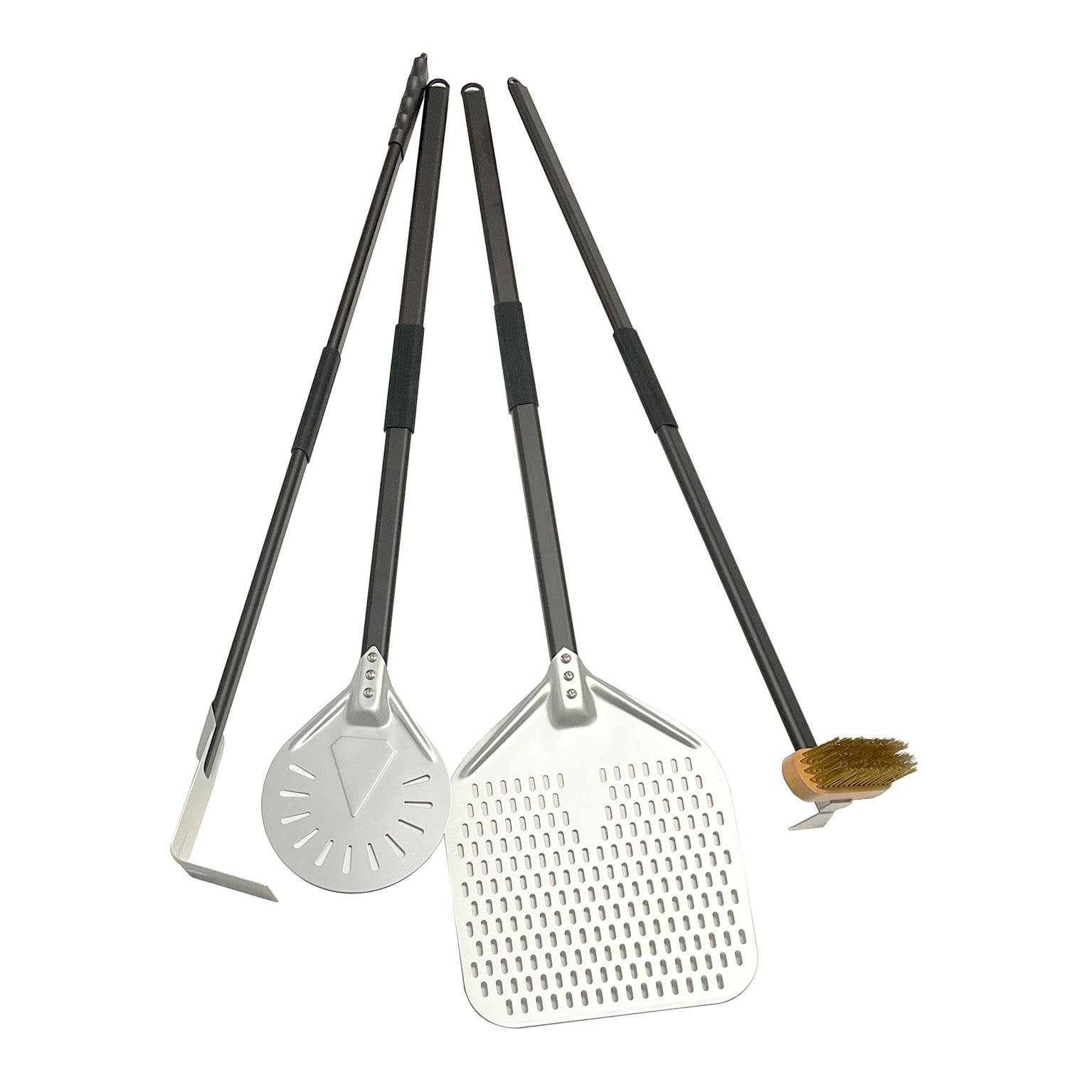 4 piece Pizza Tool Set including a large pizza peel, small round pizza peel scraper and brush.