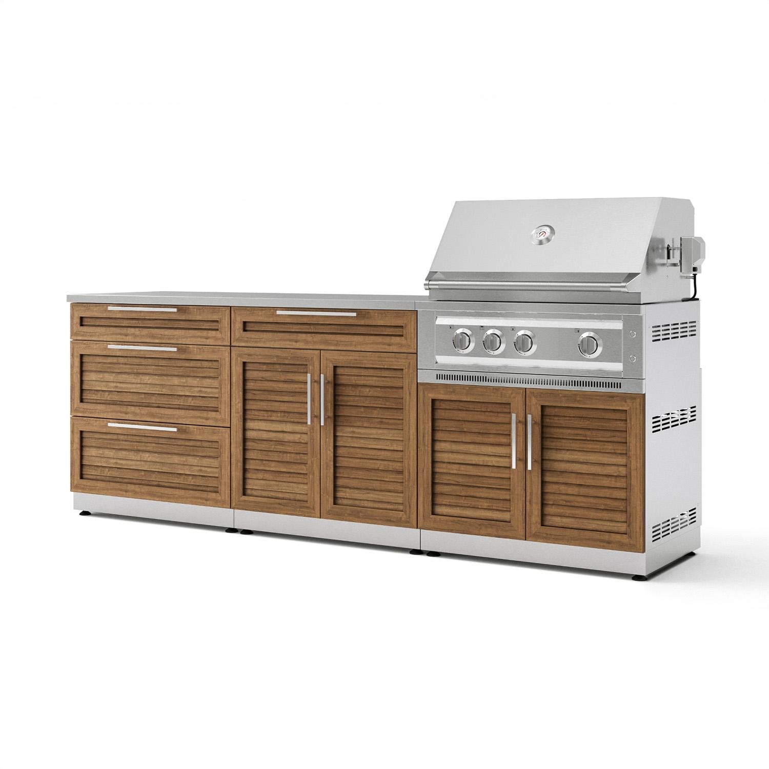 - Set Includes: 3-Drawer cabinet, bar cabinet, stainless steel worktop, platinum 33 in. grill & grill cabinet