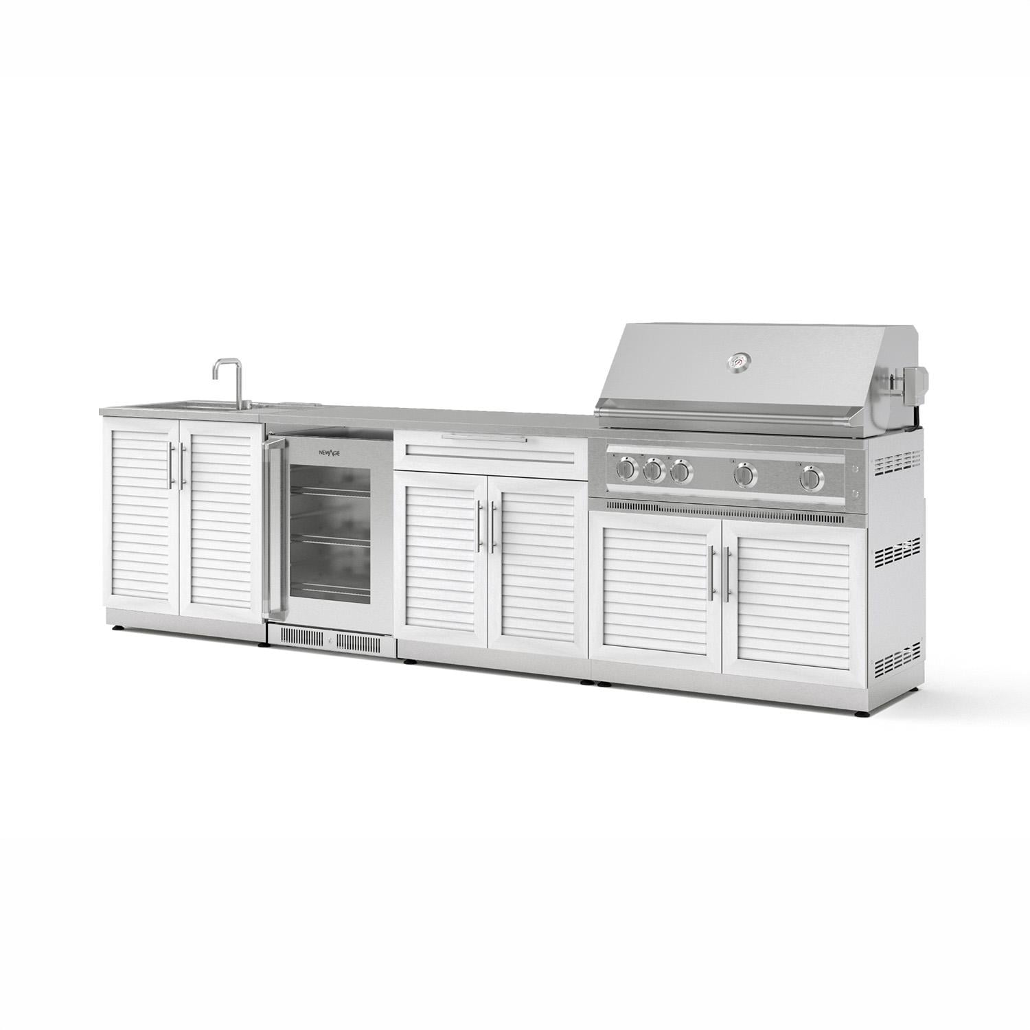 - Set Includes: Grill cabinet, 24-inch under-counter fridge with glass door, stainless steel worktop, bar cabinet, sink cabinet & platinum natural gas grill