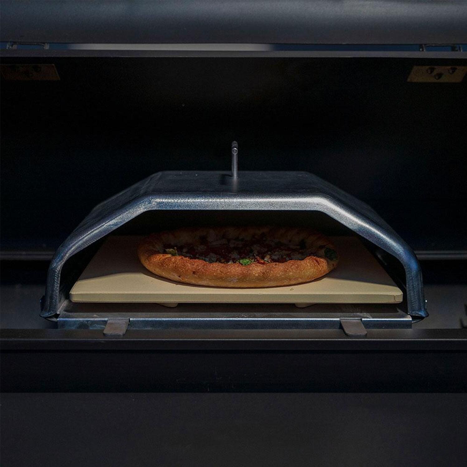 The pizza results are decent, but issues encountered with using it make me wonder why I don't just use an oven to simplify the process and elimiate stress, When placed on your grill the opening in insert a pizza is approximately 2.5". If you make a pizza with topping on it there is no room to angle the paddle to slide it off the peal. Attempts at doing so either rip toppings off the pizza or you shake the toppings off the pizza trying to they it on the cooking stone. Sometimes when trying to rotate a pizza is slides back on the the stone and becomes stuck in the pizza cooker and the only way to save the pizza is by removing the top that is 600 degrees. This should have been designed with a larger opening, and no notch in the back to become a pizza grabber.