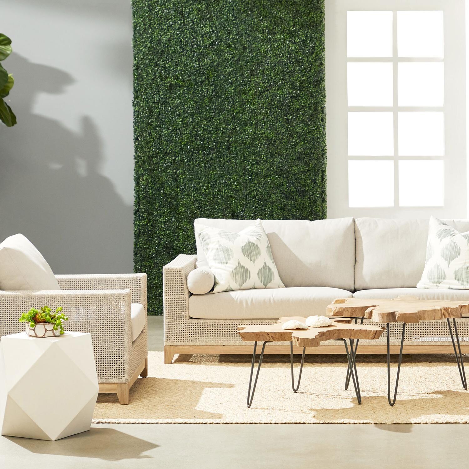 Composed of squared lines, an exposed wood base, and a rope frame, this alluring outdoor sofa chair will be an ideal addition to your patio or outdoor living space. This chair is suitable for many outdoor designs with its beachy look and transitional style. It is upholstered with a light gray olefin fabric that is weather resistant. The seat cushions are both reversible for easy cleaning, and removable for storing away in heavy weather conditions. The frame is covered with an intricately woven white and taupe rope that projects a light gray hue from a distance. The wood base is constructed with beautiful teak with gray undertones. The neutral color scheme and simple look of this chair exude a clean and airy aesthetic, which is perfect for a casual and inviting backyard atmosphere. It pairs well with the matching ottoman.