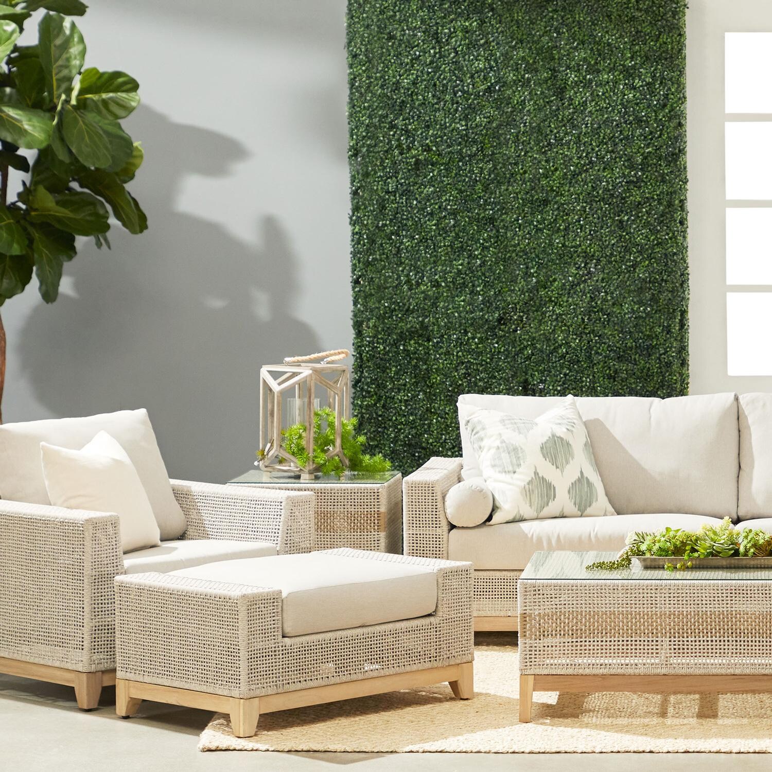 Composed of squared lines, an exposed wood base, and a rope frame, this alluring outdoor sofa chair will be an ideal addition to your patio or outdoor living space. This chair is suitable for many outdoor designs with its beachy look and transitional style. It is upholstered with a light gray olefin fabric that is weather resistant. The seat cushions are both reversible for easy cleaning, and removable for storing away in heavy weather conditions. The frame is covered with an intricately woven white and taupe rope that projects a light gray hue from a distance. The wood base is constructed with beautiful teak with gray undertones. The neutral color scheme and simple look of this chair exude a clean and airy aesthetic, which is perfect for a casual and inviting backyard atmosphere. It pairs well with the matching ottoman.