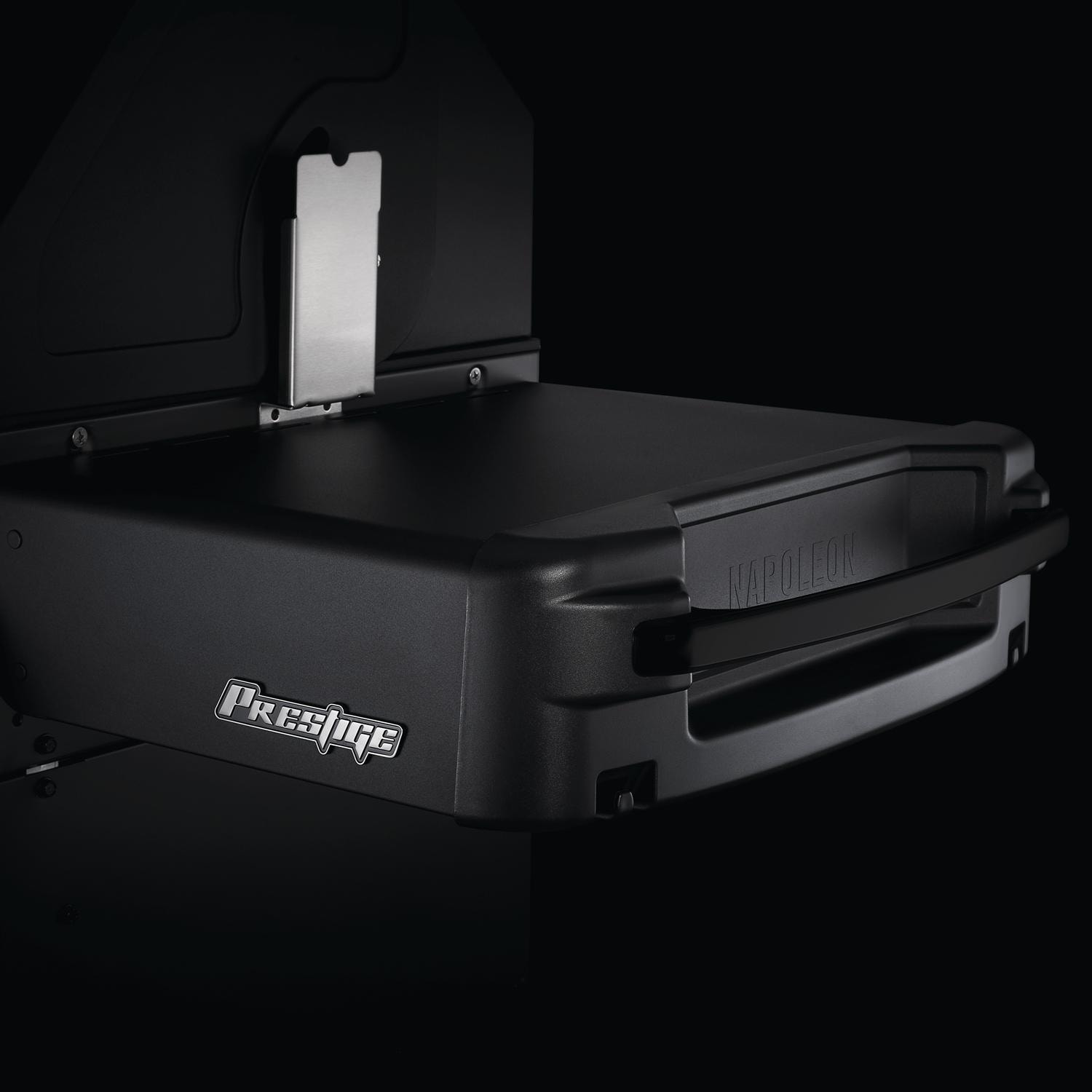 The Napoleon Phantom Prestige 500 blends quality and performance into one package and features edgy styling with luxurious matte black finishes. This freestanding propane gas grill has four stainless steel tube burners that provide up to 48,000 BTUs of cooking power. The grill has cast stainless steel cooking grates with 500 square inches of main cooking area and 240 square inches across the stainless steel multifunctional warming rack for a total of 740 square inches of cooking area. The Napoleon Jetfire ignition with crossover lighting starts each burner individually for a reliable start up every time and allows you to light all the burners at the same time. The cast stainless steel wave cooking grids create the trademark Napoleon sear lines and allow for better heat retention. The dual level, stainless steel, sear plates vaporize drippings, control flare ups and keep your food moist. The multifunctional warming rack is designed with special cutouts for grilling wings and appetizers. This Phantom Prestige 500 also has a 18,000 BTU rear infrared burner and rotisserie kit for roasting and a 14,000 BTU infrared side burner for searing meats. The hood features an Accu-Probe temperature gauge, cast aluminum end caps and retains heat for oven-like performance. The SafetyGlow control knobs turn from blue to red when a burner is in use. Clean up is a cinch with the full width removable drip pan. The grill cart is made of durable, rust and corrosion resistant black steel, features folding shelves with integrated utensil holders, double doors for storage and easy roll locking casters for moving the grill around. This Napoleon grill is manufactured in Canada.